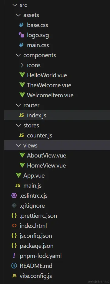 首先对于无用的文件可以先删除:像 assets 目录下的静态文件,components 和 views 目录下的组件,这些都是可以直接删掉的,同时对于 App.vue 文件,里面的大部分内容也都是可以先删除的,可以先保留如下内容: