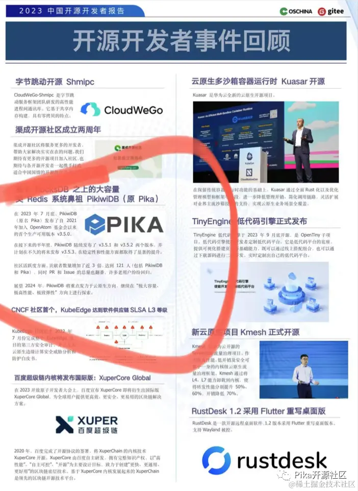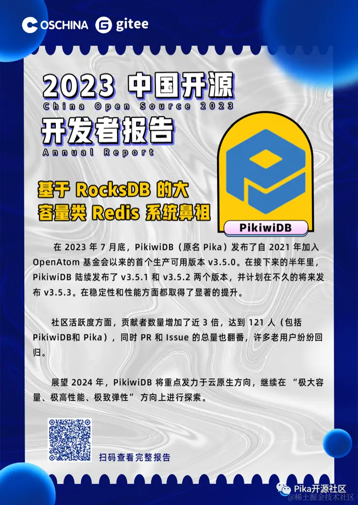 - 12 月 29 日,PikiwiDB(Pika) 第一次以 PikiwiDB 的身份亮相 Oschina 2023 年《中国开源开发者报告》