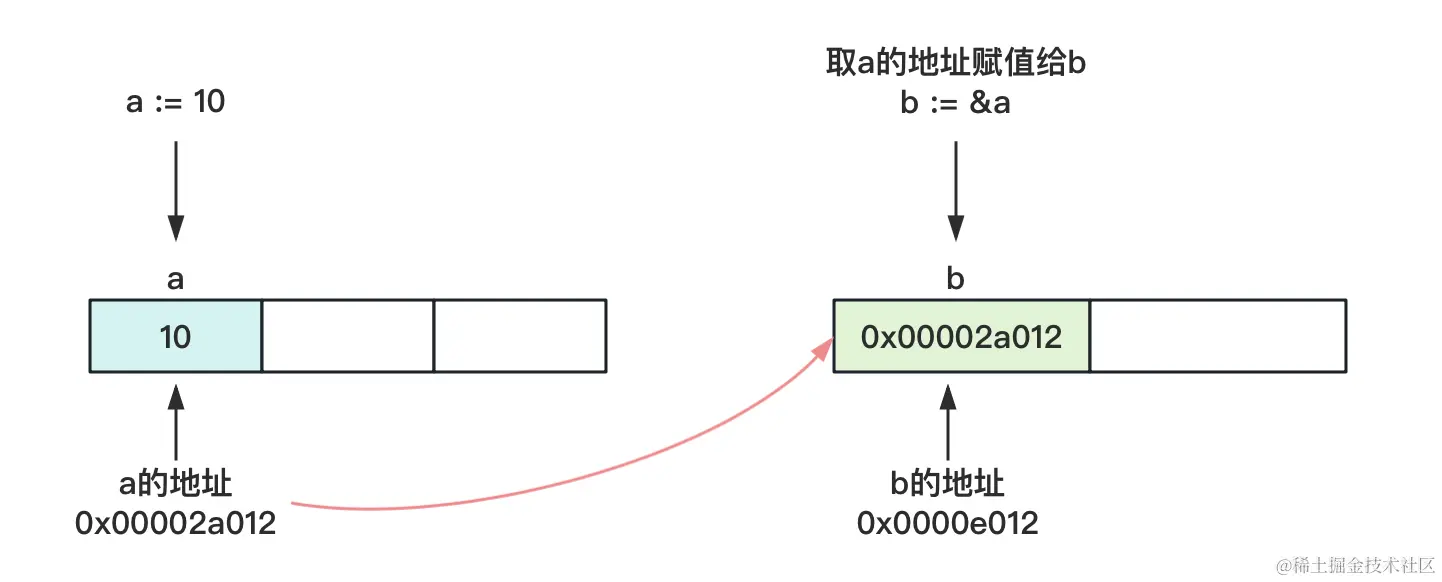 b := &a // 取变量a的地址,将指针保存到b中