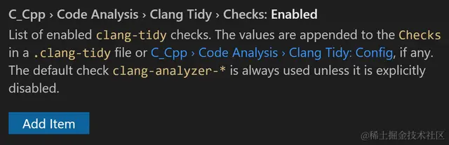 你可以向 Clang Tidy > Checks: Enabled 和 Clang Tidy > Checks: Disabled 设置添加任意数量的检查。