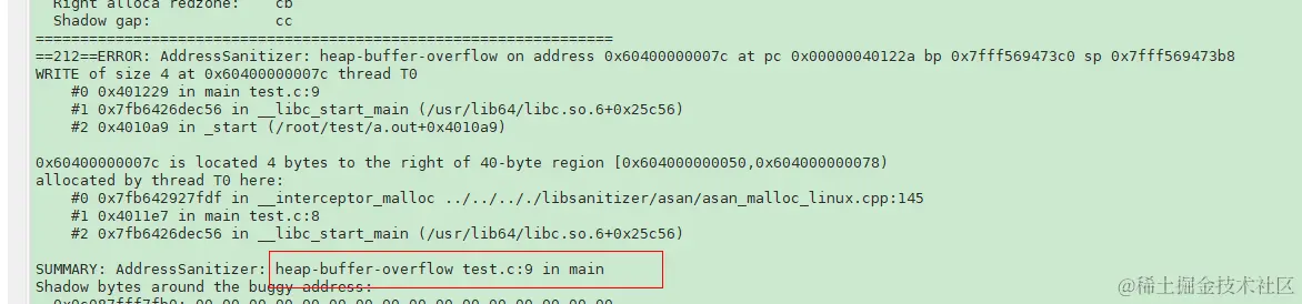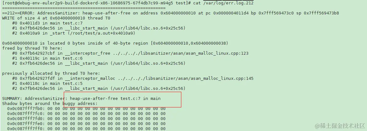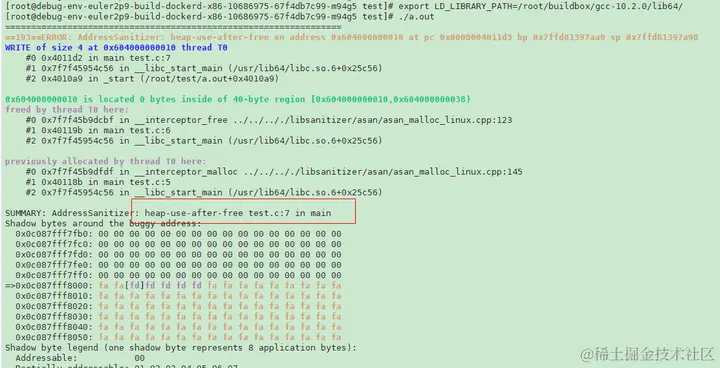 export LD_LIBRARY_PATH=/root/buildbox/gcc-10.2.0/lib64/,执行./a.out执行程序,将可以看到asan报错。指出了内存异常使用的位置和原因。