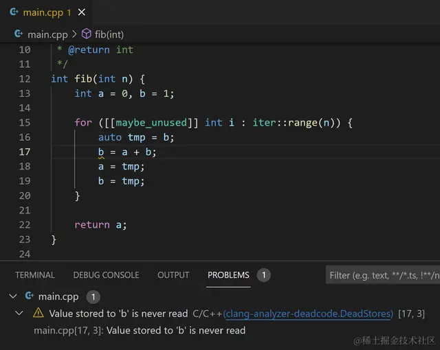clang-tidy 检查的结果(警告和错误)显示在问题面板中,并在相关代码部分下方显示为波浪线。
