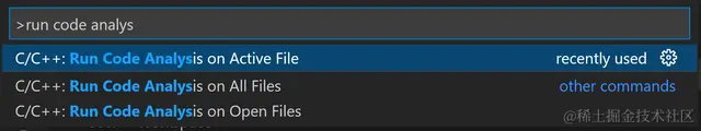 如果需要手动运行clang-tidy,请打开”Command Palette (Ctrl + Shift + P)”,并输入”Run Code Analysis”。你可以直接在单个文件上执行clang-tidy,也可以在所有已打开的文件上执行,也可以在整个工作区上执行。如下图所示: