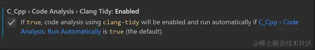 你可以使用 Clang Tidy > Checks: Enabled 和 Clang Tidy > Checks: Disabled 设置启用和禁用更多检查。 除了 .clang-tidy 文件中的检查外,还会运行这些设置中定义的检查。
