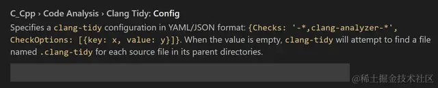 如果你的项目目录中有 .clang-tidy 配置文件,C++ 扩展将遵守该文件中定义的检查和选项。 如果你的工作区中有多个 .clang-tidy 配置文件,clang-tidy 将通过在它的上一级目录中搜索路径来使用最接近源文件的配置文件。 或者,你也可以使用 Clang Tidy: Config 设置指定 clang-tidy 配置。 Clang Tidy:Config 接受检查和检查选项作为 YAML/JSON 格式的字符串。