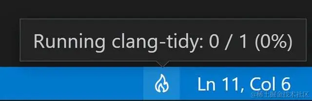 可以通过查看蓝色的状态栏中的”火”图标来判断clang-tidy是否正在运行,如下图所示: