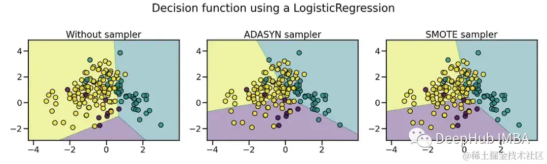 上图可以看到ADASYN和SMOTE之间的区别。ADASYN将专注于难以分类的样本,而常规SMOTE将不做任何区分。