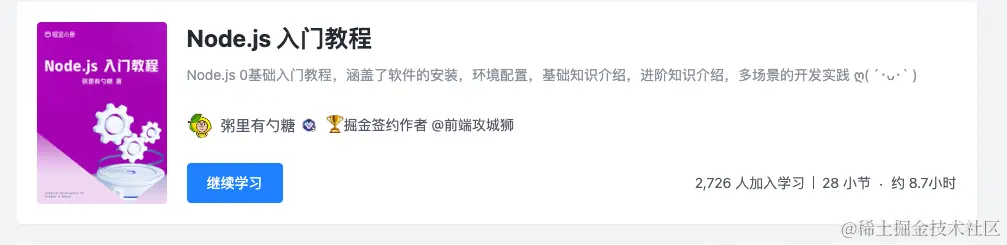 上半年受掘金运营同学的邀请,撰写了一本免费的掘金小册《Node.js 入门教程》,用户反馈挺好的。