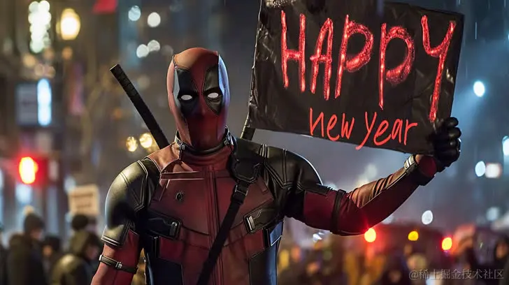 死侍手持“新年快乐”的牌子,以流行摄影氛围呈现,欢快核心,创意共享归属性,美国传统,亲和力十足的个性,明亮的氛围,疯狂有趣。