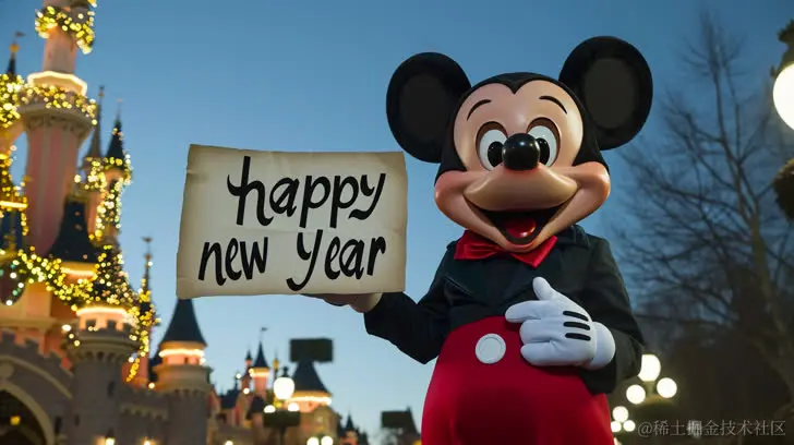 迪士尼的米奇老鼠手持标有“新年快乐”的牌子,以宏伟的纪念性风格、古老的魅力、巴黎学派风格、引人注目的标签、捕捉瞬间的本质、深蓝与白相间的暗调,照片合成技术呈现。