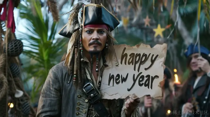 2. 杰克·斯帕罗船长手持“新年快乐”牌子