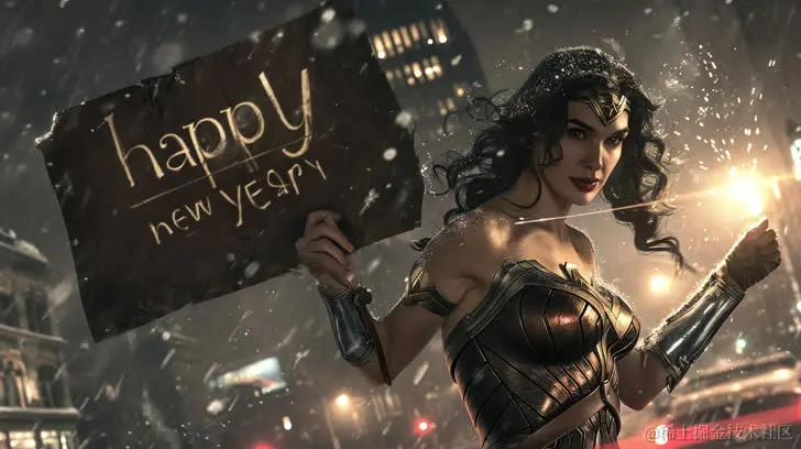神奇女侠手持“新年快乐”的牌子,采用照片逼真的技术,happycore、Yankeecore风格,引人入胜,solapunk元素,现实感。