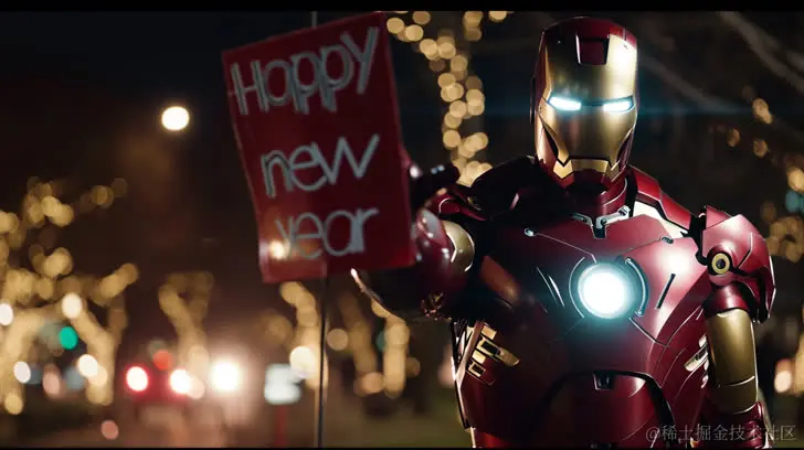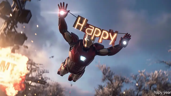 钢铁侠站在公园前持着标有“新年快乐”字样的牌子,以街头摄影风格呈现,引人入胜的纪实照片,欢快核心,32K UHD,科幻元素,霓虹灯效果。