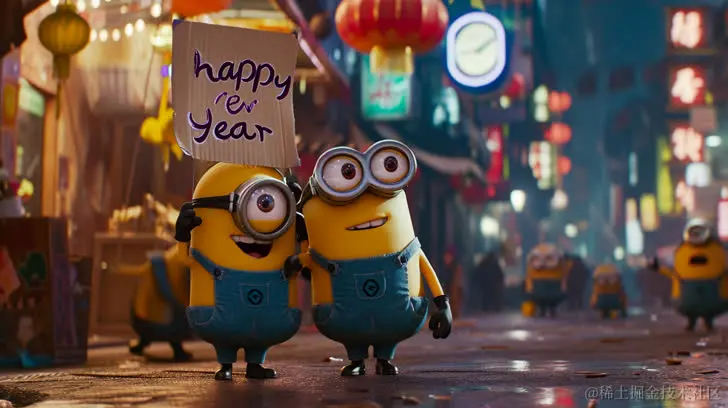 小黄人手持标有“新年快乐”的牌子,以街头摄影风格呈现,Eve Ventrue风格,传统色彩方案,照片合成,中国传统,Niyazi Selimoglu风格,富有亲和力的个性。