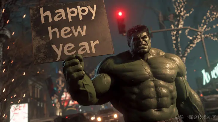 绿巨人浩克手持标有“新年快乐”的牌子,采用梦魇般的意象,历史元素,富有感染力的意境。