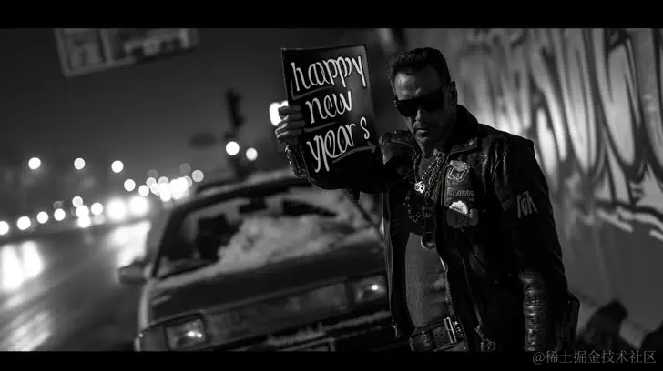 终结者举着“新年快乐”的牌子,以街头摄影风格呈现,创意共享归属性,引人入胜的纪实照片,传统元素,亲和力十足的个性,美国流行文化,深邃的氛围。