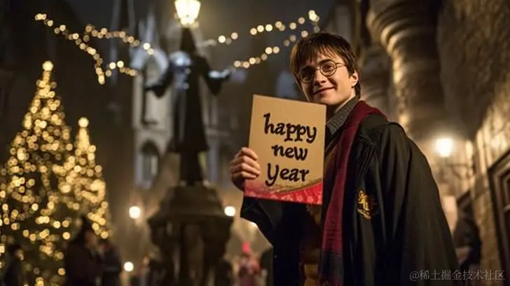 哈利·波特在雕像前持有“新年快乐”卡片,以引人入胜的照片风格呈现,节日氛围。