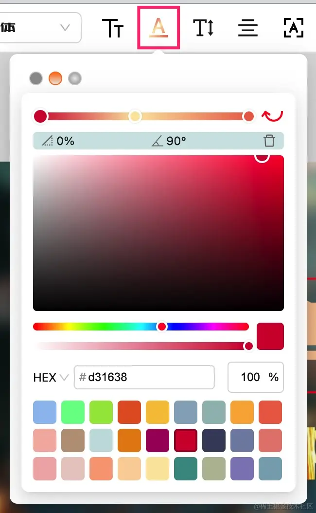 首要支持的便是颜色渐变。fabricjs 虽然支持渐变,但怎么配置确实一个难题,属实难找到一个好用的支持渐变的颜色选择器。