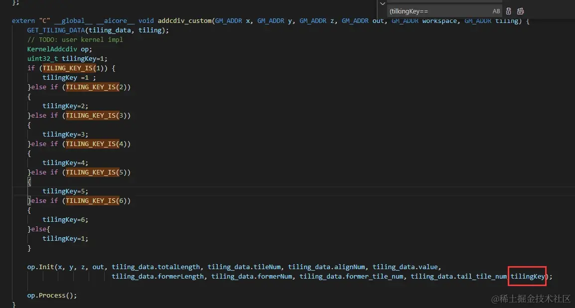 所以把上述两种情形,定义为TilingKey= 1。在host侧通过“context->SetTilingKey(1)”进行设置。在kernel侧的核函数中通过“TILING_KEY_IS(1)”进行解析,并通过临时变量“tilingKey”=1,传递给算子内的函数使用。