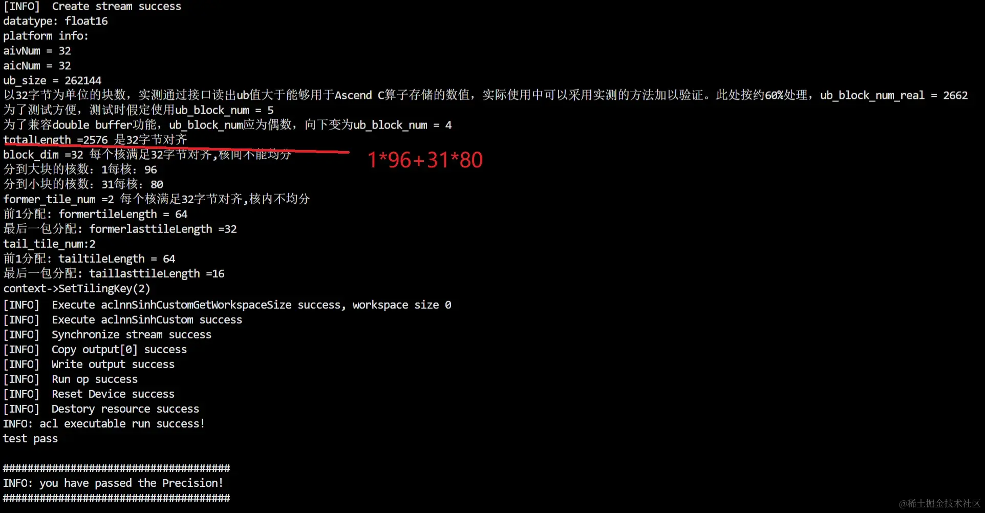 1)host侧代码:进行计算和判断时,都带上了ALIGN_NUM,保证后续的计算都是以32字节为基本单位中。将核内均分当成核内不均分的一种特定情况,当最后一块数据与前面块数据相等时,就是均分;当数据少于ub决定的块数据长度时,只有一个分块,也按均分处理,但tileLength的长度设置为分块的实际长度。