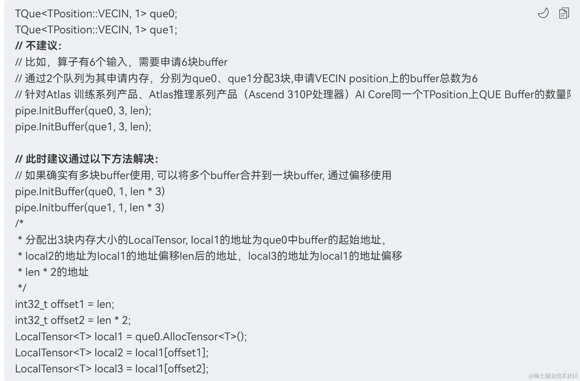 当输入向量数量为3个,如果开启double buffer,会导致VECIN上QUE的数量是3*2=6个,超过了某些处理器的限制。改进方法,可以参考参考文档的描述。www.hiascend.com/document/de…