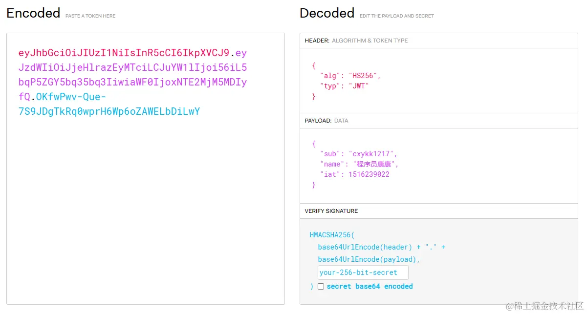 通过示例可以看出 JWT 由 Header、Payload、Signature 三部分组成。
