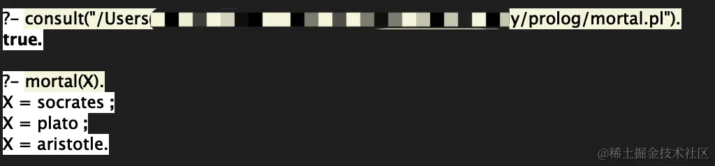 需要先把规则和事实保存到一个文件中 mortal.pl,然后使用命令 consult 加载规则,最后执行 mortal(X). 获取结果,有多个答案时,我们输入分号(;),Prolog会继续搜索直到所有可能的答案都被找到。