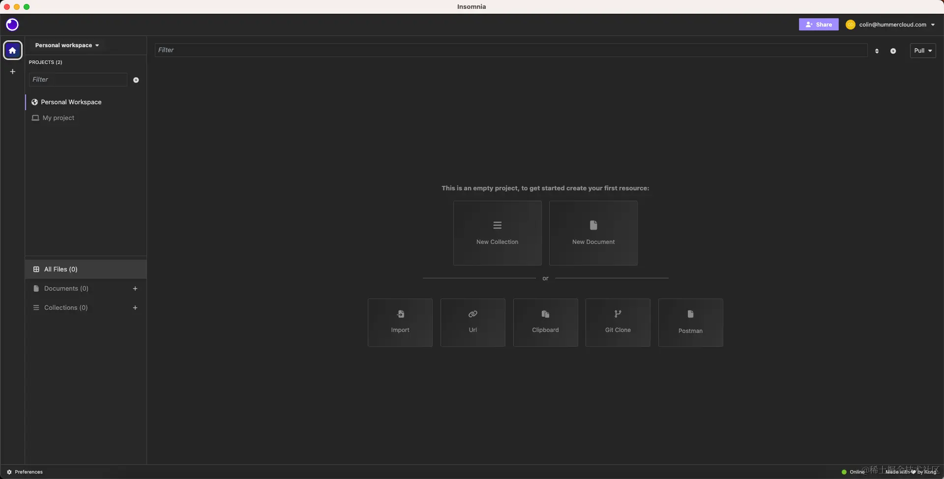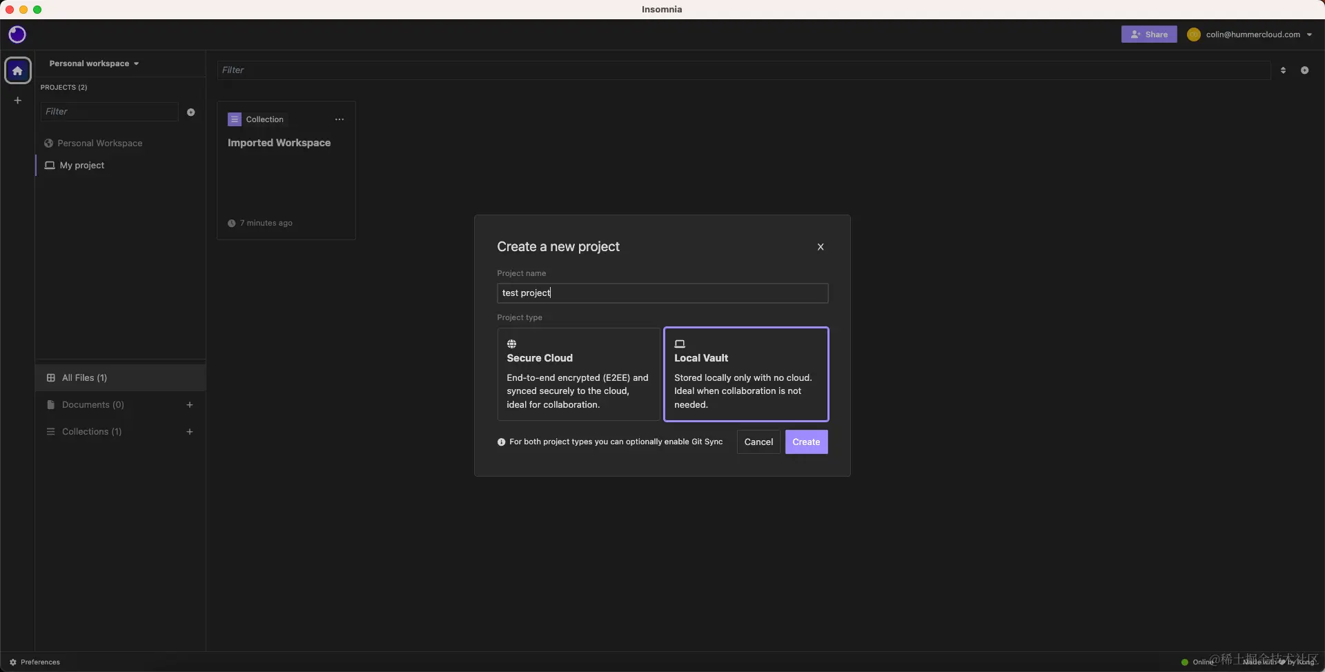 接下来,就可以使用Insomnia来进行工作了,一开要创建项目和集合,就是对API进行归类和管理,也是为了分享做铺垫。创建项目的时候可以设置存储,是使用云的还是使用本地存储。