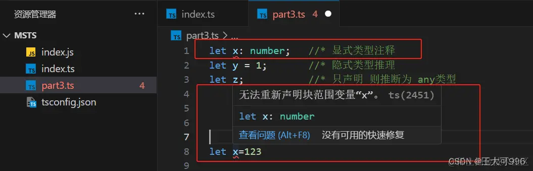 x="wdk" //提示错误 不能将类型“string”分配给类型“number”。