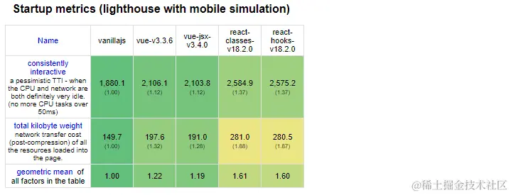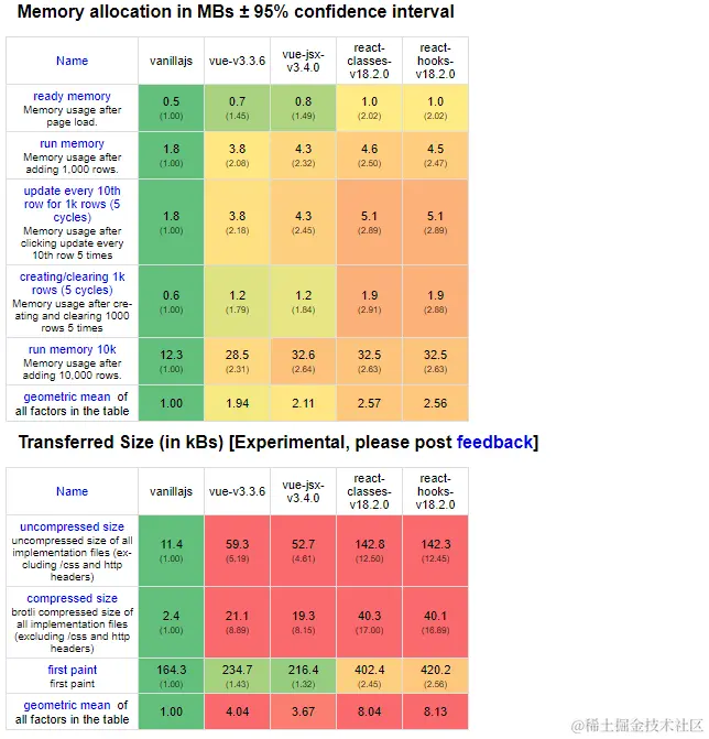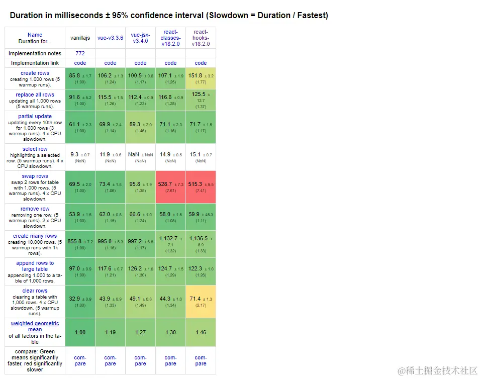 通过表格可以看出,Vue + JSX 的性能是差,但也是只略差,并不能成为抵触 Vue + JSX 开发的理由,换一方面来说,中后台开发中能触碰到到 Vue 性能瓶颈的场景真的多么?