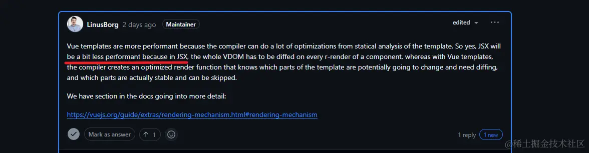 JSX 性能是比不过模板的,这点无可否认,但是模板的性能优化究竟占据了多大一个部分?Vue 模板比 JSX 更高效的原因在于,Vue 的编译过程可以在编译阶段对模板进行静态分析,并生成更精确的渲染函数。我们可以将其理解为在编译过程中, Vue 在以一种 treeshaking 的思路进行优化,通过删除无用的逻辑分支,以此生成最优代码。听起来很高大上是不是,但是按照计算机科学的角度来讲,这一部分进行的优化的效果是极为有限的,这一点我也向官方求证了,维护者对模板跟 JSX 的性能差异是这么形容的: