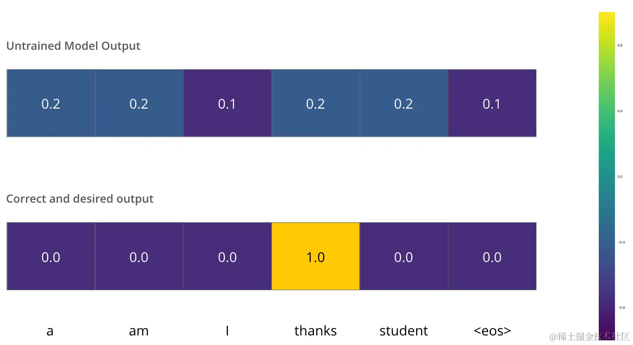 这意味着我们希望输出是表示“谢谢”一词的概率分布。但由于该模型尚未经过训练,因此目前还不太可能发生。