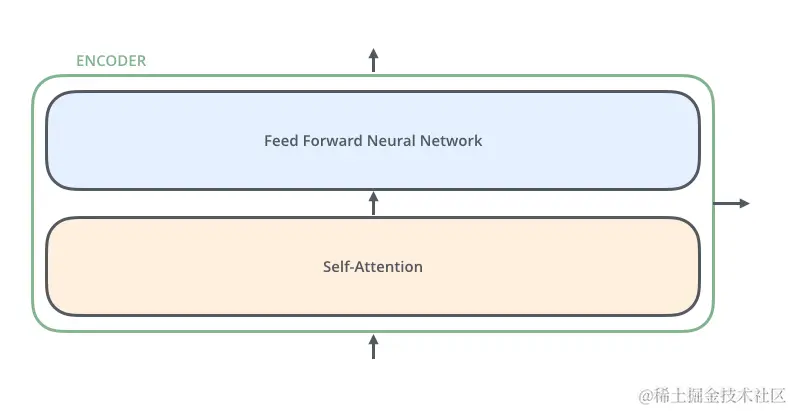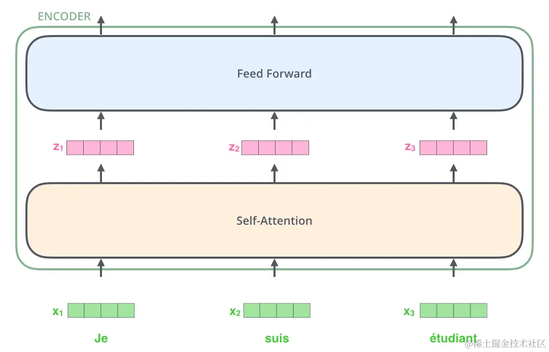 正如我们已经提到的,编码器接收向量列表作为输入。它通过将这些向量传递到“自注意力”层,然后传递到前馈神经网络,然后将输出向上发送到下一个编码器来处理该列表。