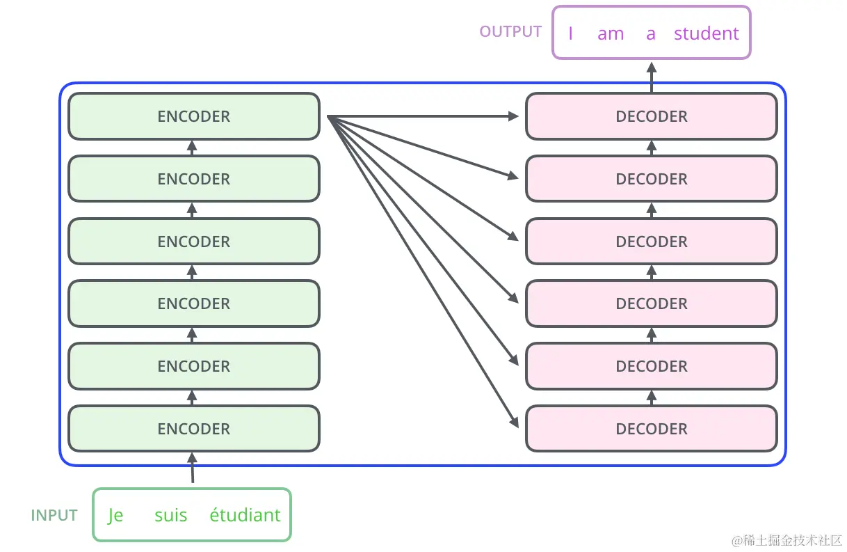 编码器首先处理输入序列。然后,顶部编码器的输出被转换为一组注意力向量 K 和 V。这些向量将由每个解码器在其“编码器-解码器注意力”层中使用,这有助于解码器关注输入序列中的适当位置: