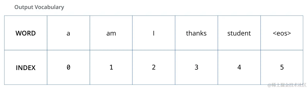 为了形象化这一点,我们假设我们的输出词汇仅包含六个单词(“a”、“am”、“i”、“thanks”、“student”和“”(“句子结尾”的缩写))