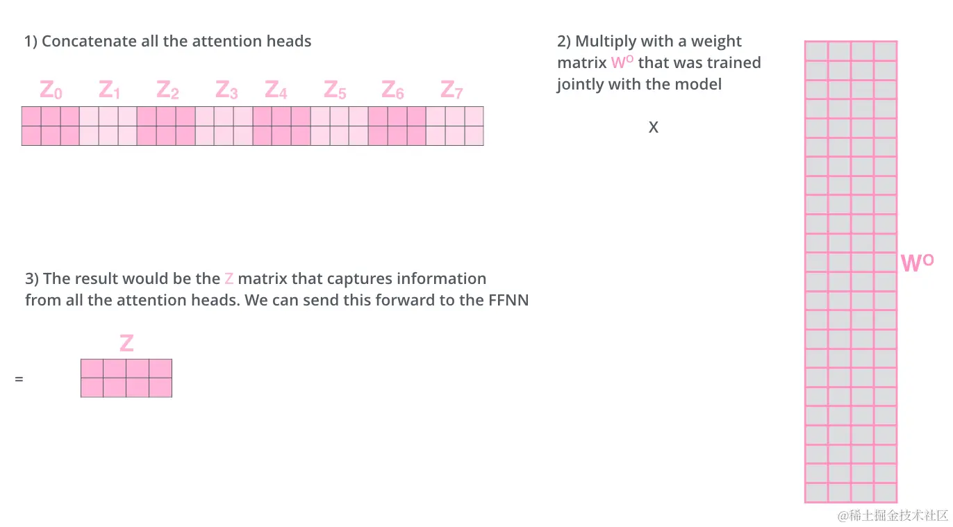 我们该怎么做呢?我们将矩阵连接起来,然后将它们乘以一个附加的权重矩阵 WO。
