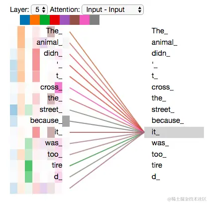 现在我们已经触及了注意力头,让我们回顾一下之前的示例,看看当我们在示例句子中对单词“it”进行编码时,不同的注意力头聚焦在哪里:
