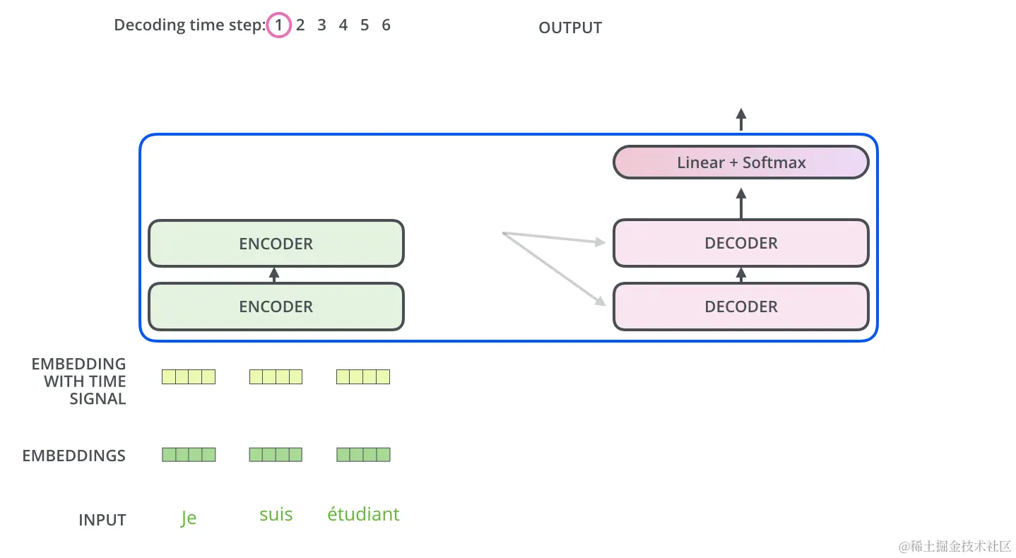 解码器中的自关注层的运行方式与编码器中的运行方式略有不同:
