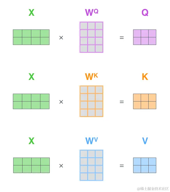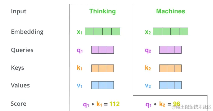 计算自注意力的第一步是从每个编码器的输入向量(在本例中为每个单词的嵌入)创建三个向量。因此,对于每个单词,我们创建一个查询向量、一个键向量和一个值向量。这些向量是通过将嵌入乘以我们在训练过程中训练的三个矩阵来创建的。