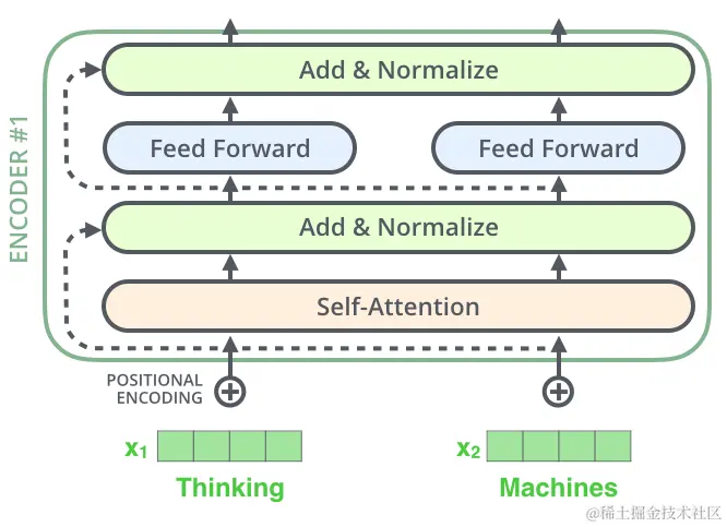 编码器的输入首先流经自注意力层,该层帮助编码器在对特定单词进行编码时查看输入句子中的其他单词。我们将在本文后面仔细研究自我注意力。