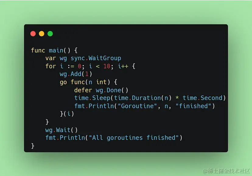 在本例中,我们创建了一个WaitGroup和10个goroutine。每个goroutine休眠数秒,然后向控制台打印一条消息。我们使用WaitGroup来确保在打印最终消息之前所有的goroutine都已经完成。