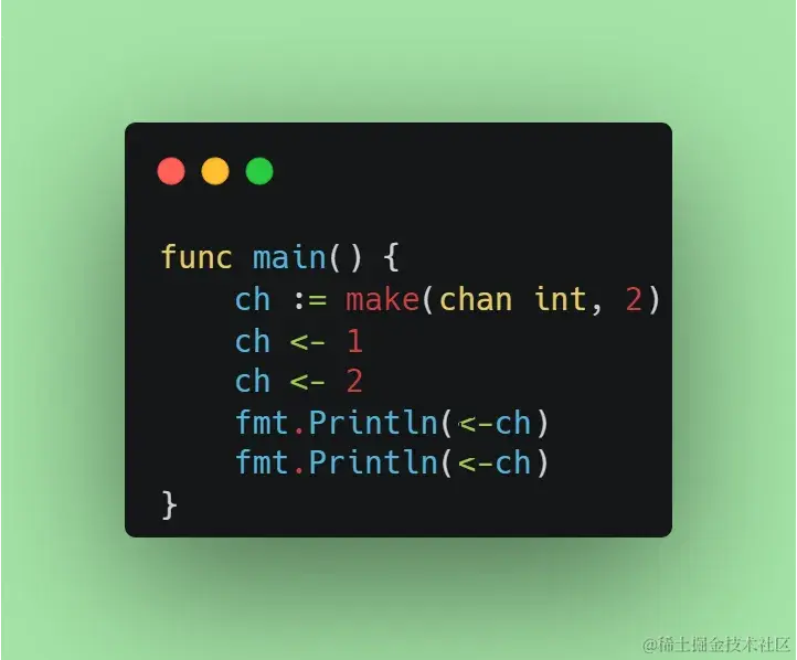 在本例中,我们创建了一个缓冲区大小为2的int类型的缓冲通道。然后使用<-操作符向通道发送两个值(1和2)。最后,我们使用<-操作符从通道接收值,并打印到控制台。