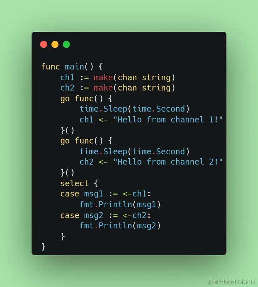 本例中创建了两个通道(ch1和ch2)和两个向这些通道发送消息的goroutine。然后,我们使用select语句等待消息到达ch1或ch2。当消息到达时,将其打印到控制台。