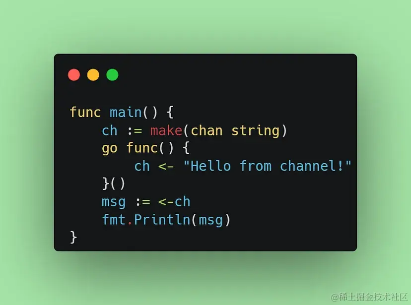 在本例中,make函数创建了一个string类型的channel。然后,我们创建一个使用<-操作符向channel发送消息"Hello from channel!"的goroutine。最后,我们使用<-操作符从channel接收消息并将其打印到控制台。
