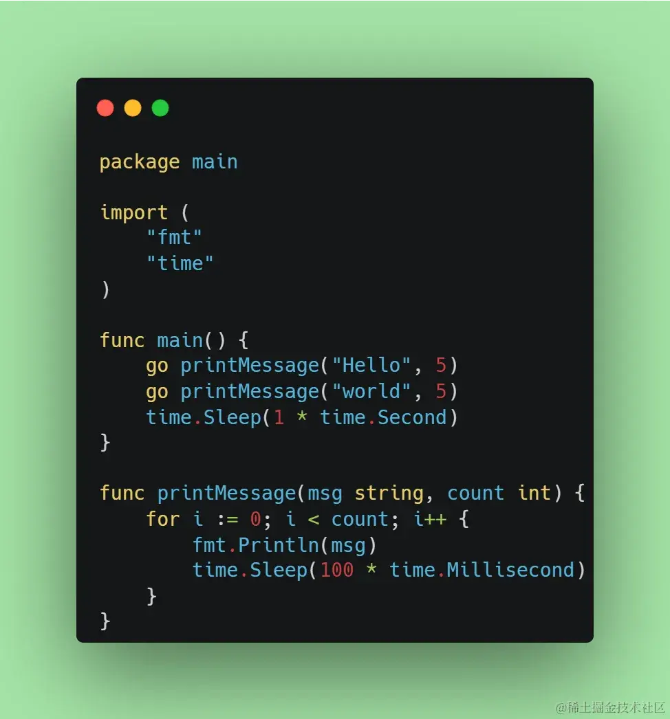 在main函数中,调用go printMessage("Hello", 5)和go printMessage("world", 5)来启动两个goroutine。这创建了两个与主线程并发运行的独立执行线程。time.Sleep(1 * time.Second)语句用于将主线程暂停一秒钟,这给了两个goroutine足够的时间来执行和打印消息。