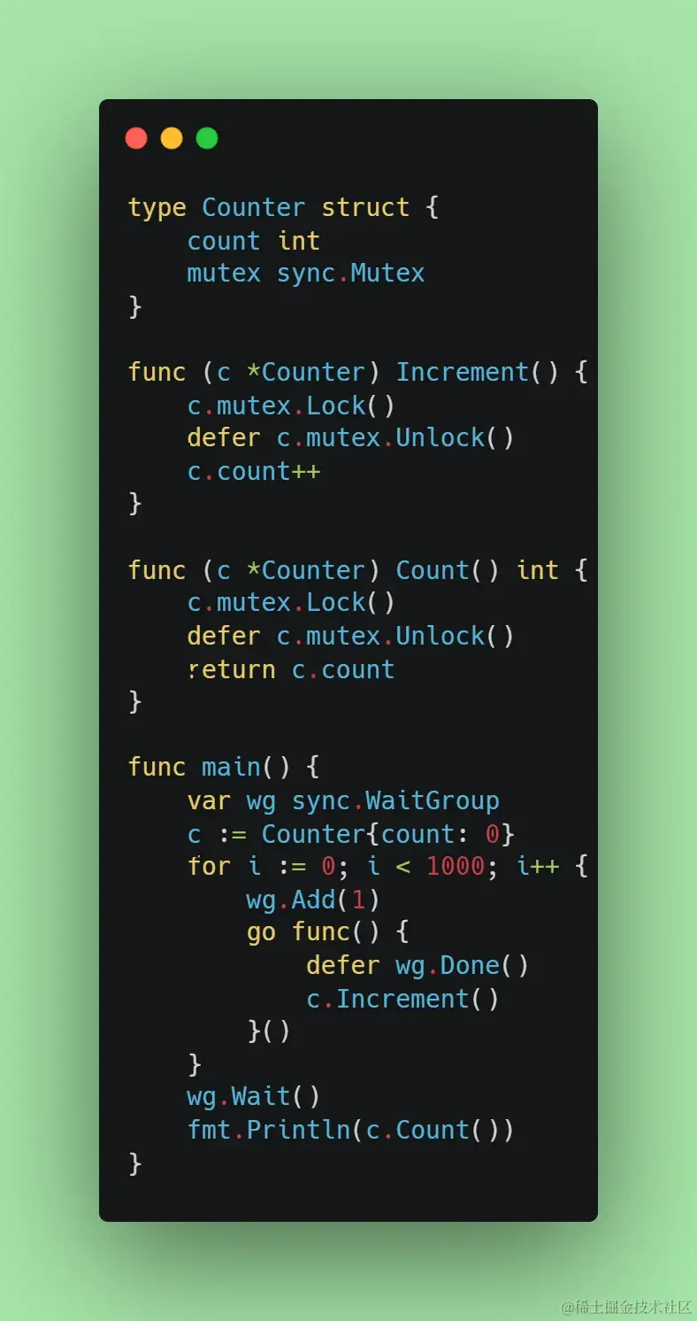 在这个例子中,我们定义了一个Counter类型,包含count字段和一个sync.Mutex。在Counter类型上定义了两个方法: Increment()和Count()。这两种方法都使用互斥锁来确保一次只有一个goroutine可以访问count字段。最后,我们创建1000个增加count字段的goroutine,在打印最终计数之前等待它们全部完成。