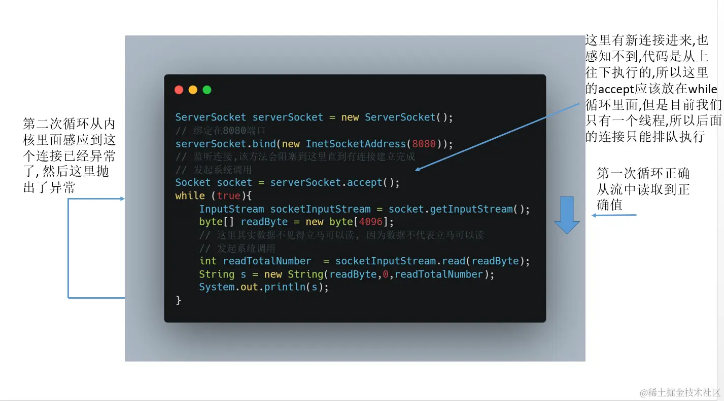 所谓的BIO,Blocking在read上面,读数据的时候未必还可以读,数据的流转需要一个过程,但是我们不希望被阻塞在这里,我们自然能够想到,能否让操作系统为我们提供一个非阻塞的read函数,这个read函数的效果是,如果没有数据到达时,立刻返回一个值,而不是立刻等待。