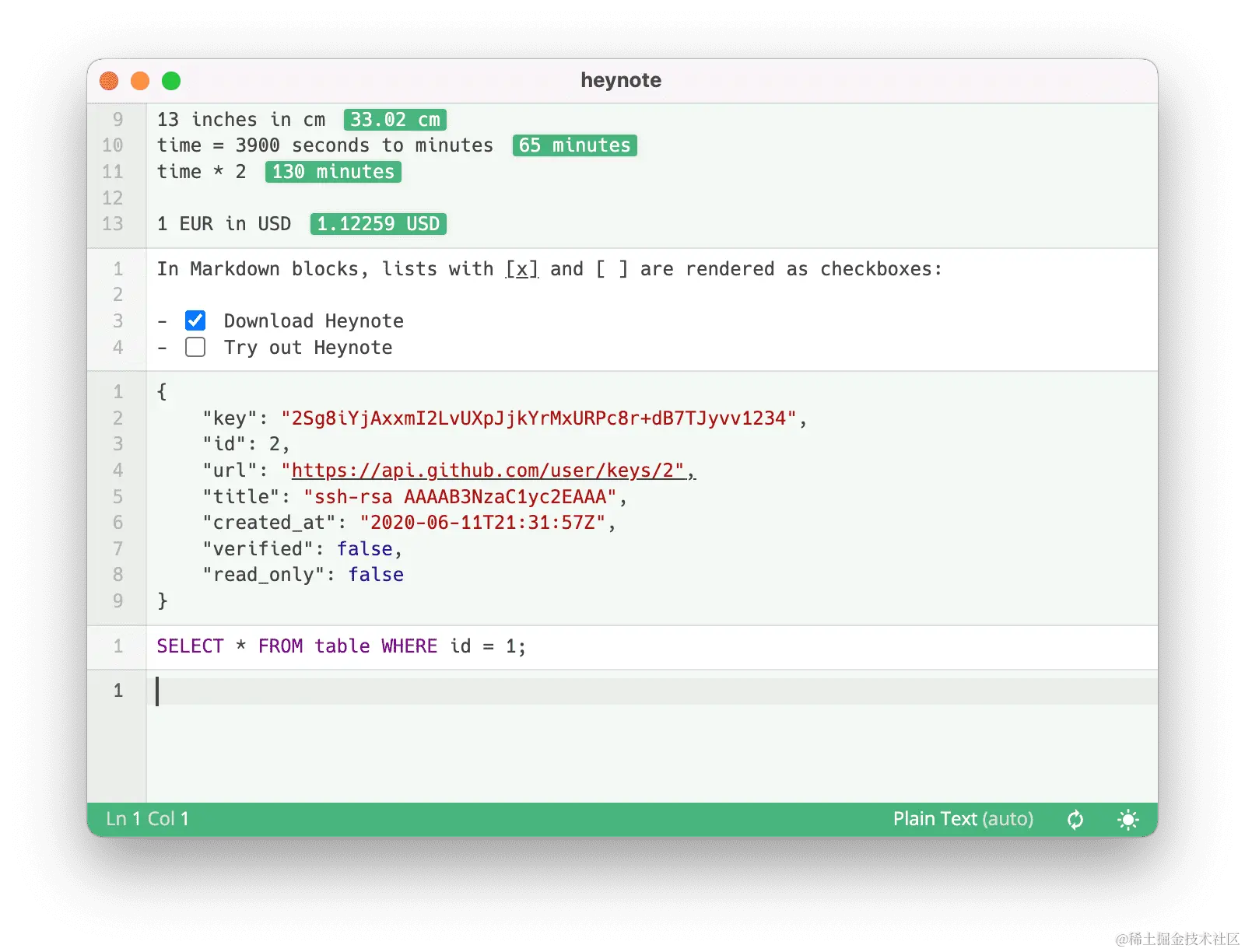 专供开发者的便签应用,它的强大之处在于可以轻松将不同的内容分块暂存起来,支持自动语法高亮、自动格式化、计算器模式、多光标编辑、全局热键等功能,适用于 Windows、macOS 和 Linux。
