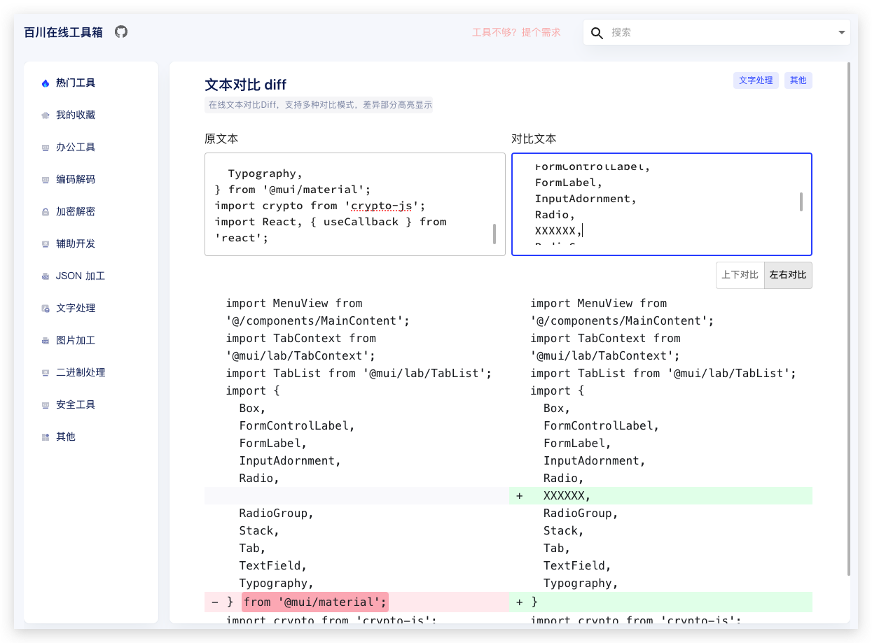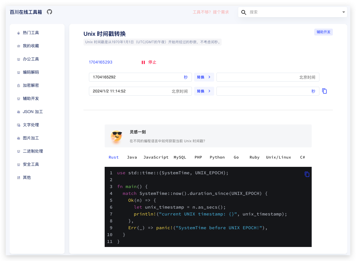 还提供编码解码、加密解密、辅助开发、JSON 加工、办公工具、文字处理、图片加工、其他多种类型