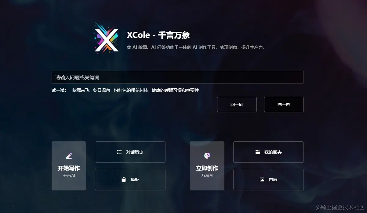 XCole千言万象是一个集AI文字创作和AI绘图于一体的创作工具,它以用户的创作需求为核心,致力于提供快速、高效、高质量的内容创作服务。操作简便、生成迅捷、质量上乘,是每一个创意工作者不可或缺的智能伙伴。 快速访问官网 :xcole.cn